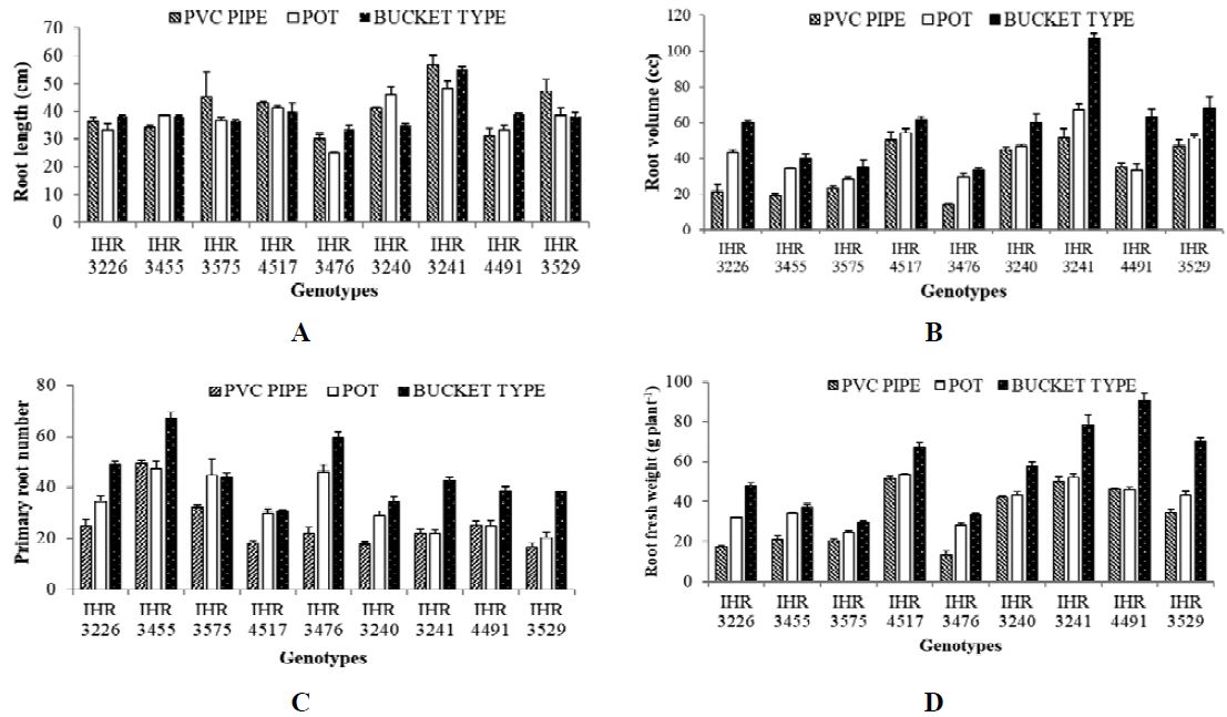 The container size plays a major role in plant root and shoots growth. The root length was not significantly influenced by the container type. However, among the three containers, higher root length was observed in PVC pipe container compared to bucket type and pot type containers. The root volume in bucket type container was 35.8% and 72.4% higher compared to pot type and PVC pipe containers, respectively (Figure 1). The studies conducted in bell pepper have shown that the container size has influence on the root volume and plant growth (Weston, 1988; Nesmith et al.,1992). In this experiment, among the three types of containers, the plants grown in bucket type container produced significantly a greater number of primary roots (44.8) compared to pot type (33.1) and PVC pipe (25.4) containers (Figure 1). Studies conducted by Cantliffe, (1993) and Kharkina et al., (1999) have shown that there is a strong positive correlation between container size and root biomass. In the present study, significantly higher root fresh weight and dry weights were observed in bucket type container compared to other two types of containers (Figure 1). The genotypes IHR 4491, IHR 3241, IHR 4517 and IHR 3529 produced significantly higher root fresh weight as compared to remaining genotypes (Figure 1). Plants grown in bucket type container recorded 73.14 % (4.32 g) and 40.86% (5.31 g) higher root dry weight compared to PVC pipe and pot type containers (Table 1).