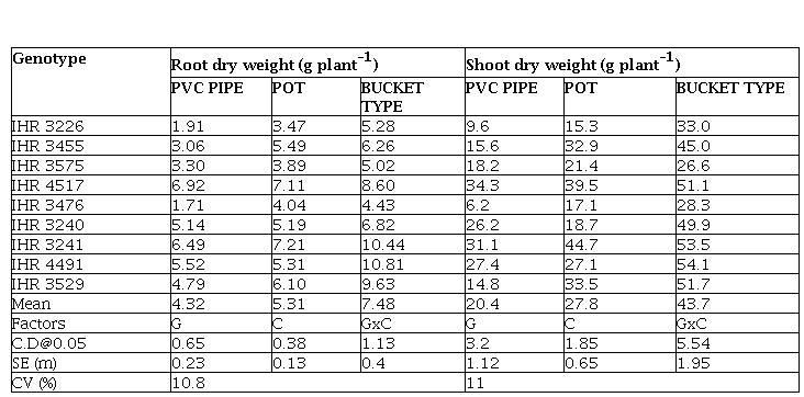 In order to identify appropriate container for high throughput phenotyping of root characteristics, nine genotypes belonging to different Capsicum sp. IHR 3226, IHR 3455, IHR 3575, IHR 4517, IHR 3476 (C. annuum) IHR 3240, IHR 3241, IHR 4491(C. baccatum) and IHR 3529 (C. chinense) were selected. The genotypes were evaluated in three types of containers having different dimensions and soil media holding capacity. The containers used were: (i) bucket type container (Empty paint container, 30 cm diameter, 32 cm height having capacity to hold 23 kg soil), (ii) PVC pipe container (20 cm diameter, 64 cm height having capacity to hold 26 kg soil) and (iii) pot type container (18 cm diameter, 27 cm height having capacity to hold12 kg soil). The containers were filled with soil, Farm Yard Manure (FYM) and sand (2:1:1 v/v). The experiment was laid out in a factorial completely randomized block design with five replications.