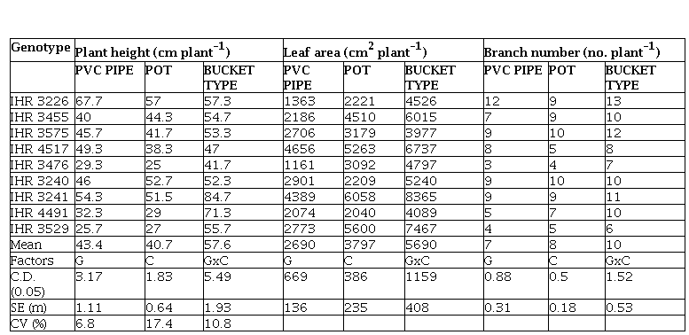 Healthy root system growth promotes better above ground canopy growth. Hence, providing appropriate space for adequate root growth is essential. It is observed that the shoot growth is greatly impacted by varying container size and root restriction (Poorter, 2012). The plant height was significantly higher in bucket type container compared to remaining types of containers. Genotypes, IHR 3241 (68.1 cm) and IHR 3226 (57.2 cm) recorded significantly higher plant height compared to rest of the genotypes (Table 2). Tomato plants when grown in containers with low volume showed reduction in shoot height and biomass (Peterson et al., 1991). Hence, providing better rooting space helps the plants to produce higher above ground biomass with increased shoot height. Among the three types of containers, plants grown in bucket type produced significantly a greater number of branches compared to remaining two types of containers (Table 2). In bell pepper (Capsicum annum L.), root restriction caused reduction in number of branches (Nesmith et al.,1992). In container grown bell pepper plant, reduction in leaf area was observed mainly due to smaller and fewer leaves per plant (Weston, 1988; Nesmith et al., 1992). With the increase in container size, the leaf area and shoot biomass has increased (Cantliffe, 1993). In this experiment, the leaf area was significantly higher in plants grown in bucket type container (5690 cm2) as compared to pot (3797 cm2 ) and PVC pipe (2690cm2 ) containers (Table 2).