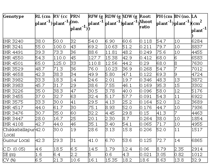 desirable root characteristics such as root length, root volume, primary root number, root fresh and dry weight. The genotypes, IHR 3982 and IHR 3447 showed poor root characteristics (Table 3). Studies have indicated that root length, root volume and root dry weight have strong positive correlation with total dry matter production (Lakshmamma et al., 2014). The genotypes which showed higher root length and volume also produced higher biomass because of adequate water and nutrients uptake from deeper layers of the soil and maintained the tissue water potential (Khan et al., 2008).