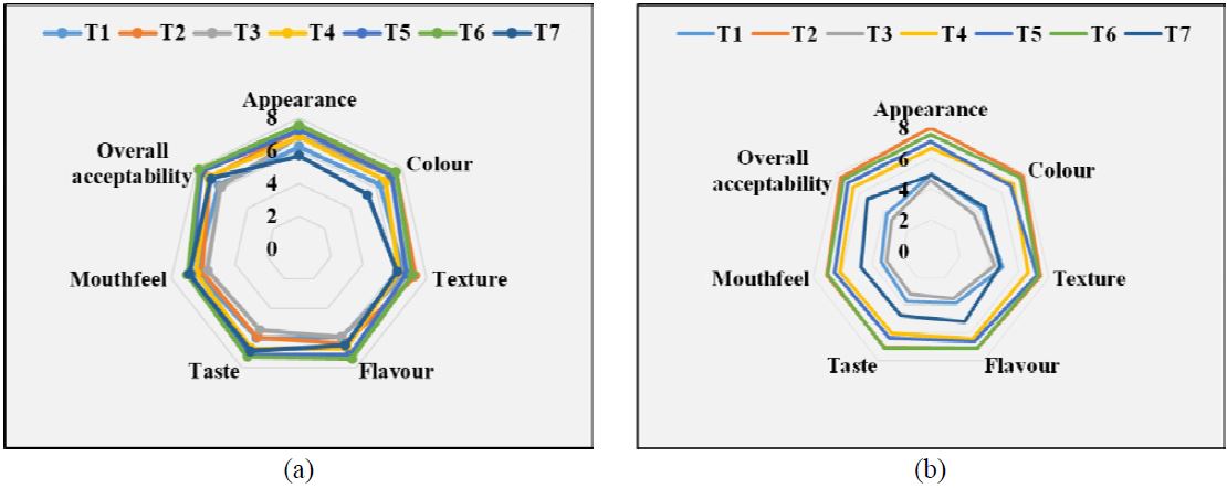 Among the seven treatments of storage, kernels stored in sugar syrup were the most accepted ones, both at the first and last months of storage (Fig 1). According to Ponting (1973), sugar uptake by the product kept in sugar solution, through osmotic process, modified the composition and taste of the final product. In this experiment, the scores obtained for flavour (6.40-7.07) and taste (6.00- 7.07) were higher for kernels in sugar syrup. The uptake of sugar in the kernel might have resulted in the increased taste and flavour leading to enhanced palatability and higher score. Kernels preserved in 70° B sugar syrup had the highest overall acceptability score (7.40) followed by kernels in 60° B (7.00) and 50° B (6.60) sugar syrup; higher sugar level might have resulted in more absorption.