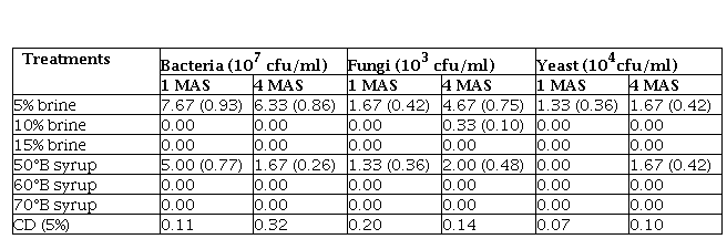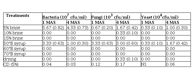 The microbial count of both kernels and keeping solution is presented in table 1 and table 2. Among the seven treatments of storage, the bacterial count was beyond permissible limit both in the solution and kernels stored in 5% brine as well as in 50°B sugar syrup.