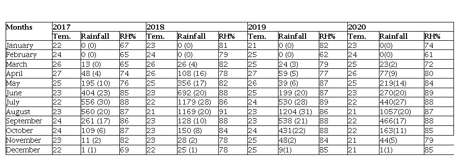The plant material included in the present study comprised of four F. progenies, S.5083, S.5084, S.5085 and S.5086 generated from reciprocal crosses between two arabica genotypes, ‘Chandragiri’ and Sln.10 (Table 1). Two elite plants of Sln. 10, characterized as homozygous and heterozygous for SH3 gene for rust resistance were used in crossing programme, in order to validate the differential response of hybrids, if any. All the four progenies were planted in a compact plot at research farm of Central Coffee Research Institute, Balehonnur, Karnataka, India (13º 22’ N, 75º 25’ pool. Among the commercially cultivated species, four resistance factors (SH1, SH2, SH4, SH5) were E at an elevation of 2787 MSL), during the year 2012. The weather data pertaining to the study identified in C. arabica the only tetraploid species of the genus while four other factors (SH6, SH7, SH8, SH9), were reported from diploid species, C. canephora and SH3 factor from another diploid species C. liberica [Wagner and Bettencourt, 1965 ; Vishveshwara, 1974 ; Bettencourt and Rodrigues, 1988]. It has been well established that the resistance genes identified in C. arabica, are less durable under field situations while the genes viz., SH6, SH7, SH8, SH9 introgressed from the diploid period is furnished in Table 2. In all, 60 plants per progeny were planted in a conventional square design at a spacing of 5’x5’ under a two-tier shade canopy, the top cover of evergreen natural forest trees and lower canopy comprising of fast-growing leguminous trees like Erythrina lithosperma Miq. (Dadap). The plants were trained on topped single stem system and standard agronomic practices recommended for semi-dwarf arabica genotypes were followed. The progenies have been evaluated species either from C. canephora or from C. liberica (SH 3) are found to manifest durable for vegetative vigour, field tolerance to leaf rust and crop yield. resistance. Hence, the resistance breeding strategies have been mainly focused on pyramiding of