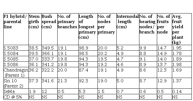 For agronomic evaluation in respect of vegetative vigour, data was collected from 20 plants for each progeny (five plants per replication) for three crop seasons till the bush canopy was totally covered. For assessment of vegetative vigour, data on the growth parameters such as stem girth, bush spread, number of primary branches, length of the longest primary, number of nodes per primary, inter nodal length and yield component characters such as number of bearing nodes per primary, number of fruits per node was recorded. The fruit yield per plant and progeny yield was recorded during harvest season i.e., Nov. - Dec. for four crop seasons from 2017 to 2020. Data was also collected from Chandragiri and Sln.10 the parents.