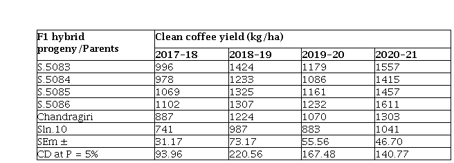 The findings of the present study are of high applied value and clearly established the efficiency of F. breeding strategy for development of vigorous, high yielding and durable rust resistant F. hybrids in arabica. The extent of heterosis in arabica coffee is found to be dependent on the genetic distance and combining ability of the parental genomes. The two F. hybrids, S.5086 & S.5085 that recorded promising performance in terms of crop yield coupled with high field tolerance to leaf rust have potential implications for commercial exploitation.