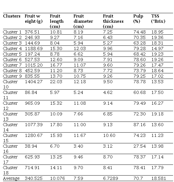 The cluster mean analysis (Table 1) reveals that there is a huge variation among the clusters. Highest fruit weight of 1404.27 g was recorded in cluster 10 followed by cluster 15 with 1280.67g. Whereas the lowest fruit weight was recorded in cluster 16 (30.94g). The highest fruit length (22.03 cm) was recorded in cluster 10 followed by 17.80 cm in cluster 14. Similarly, the fruit diameter was highest (12.18 cm) in cluster 10 followed by 12.03 cluster 4. The fruit thickness was highest (10.60 cm) in cluster 15 followed by cluster 4 with 9.96 cm. The pulp recovery was maximum (87.16%) in cluster-14 followed by cluster 4 and 18 with 79.28 and 78.41 %, respectively.