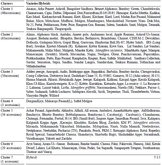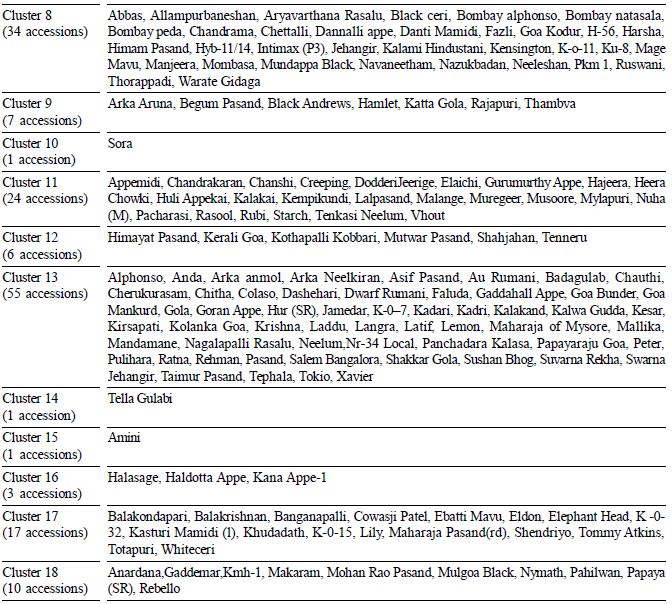 The analysis of variance for 6 quantitative traits showed significant difference among 400 germplasm of mango indicating the existence of diversity. These germplasms have been grouped in to 18 clusters and distribution of germplasm among the clusters varied in numbers which indicates that genetic divergence was related to geographical differentiation. The clustering of genotypes from different ecogeographical locations in to one cluster can be attributed to possibility of free exchange of germplasm. Similar observation was recorded by Singh and Gupta. However, unidirectional selection practiced for a particular trait or a group of linked traits in several places may produce similar phenotype which can be aggregated in to one cluster irrespective of their geographical origin as reported by Singh and Gupta (1968). The maximum inter cluster (D2) value was obtained between cluster 10 and cluster 11. These clusters may be used for hybridization programme due to wide variability and possibility of transgressive segregants (Singh, 1991; Singh et al., 1991). The minimum cluster distance was obtained in cluster 2 and cluster 5 which indicates that the accessions belonging to such clusters are relatively close. The selection of parents from genetically close clusters may be due to narrow genetic base and inbreeding depression (Singh and Gupta, 1968).