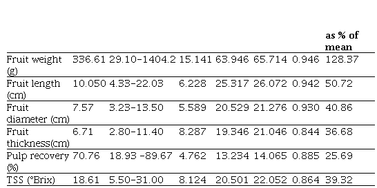 Estimates of phenotypic variance and genotypic variance had only a narrow difference for all six characters studied indicating that these characters are not much influenced by environmental factors (Table 3). This also suggests the presence of sufficient genetic variability which can be exploited by adopting clonal selection or selection of chance seedlings. The maximum PCV was recorded for fruit weight followed by fruit length and fruit diameter. This indicates the better scope for phenotypic selection of these traits for improvement.