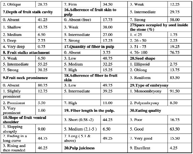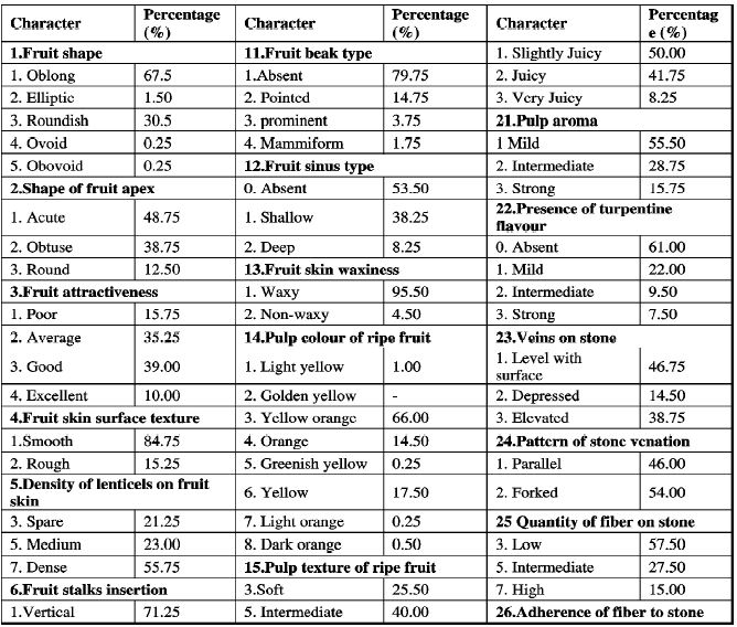 Out of 30 qualitative characters studied in 400 germplasm, the fruit shape distribution was observed to be oblong (67.5%), .elliptic (1.50%), roundish (30.5%), ovoid (0.25%), and obovoid (0.25%), fruit attractiveness, fiber free, pulp recovery (>70%) , pulp aroma (mild 55.50 (%), intermediate (28.75%) and strong (15.75%)); TSS and eating quality (poor (16.75%), good (63.50%), very good (15.50%) & excellent (4.25%) are very important for commercial point of view.