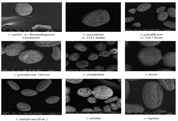 The details of pollen morphology of the nine genotypes of jasmine are furnished in Table 1 Scanning Electron Microscope (SEM) images of the Jasminum genotypes indicated wide variations in shape of pollen among the genotypes.