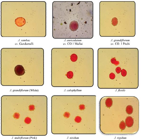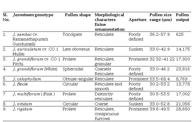 Palynological data are essential pre-requisites of any plant breeding programme. Domez and Isik (2008) and Hanif et al. (2013) emphasized the association of palynological aspects with the cytological status of plant species. The present study was undertaken to investigate and document the palynological parameters of commercial and lesser-known species of Jasminum which would serve as a reliable reference for future jasmine breeding programmes.