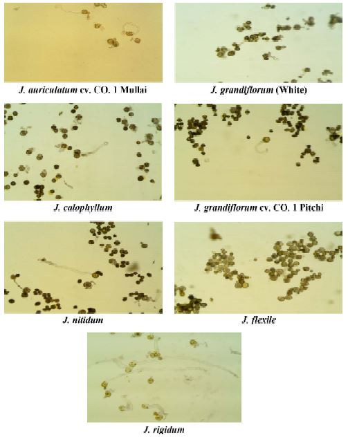 In the various jasmine species studied, pollen germination percentage was low to moderate (Plate 2). This might be associated with the irregular meiosis leading to defective pollen and egg cells, ultimately resulting in sterility. Datta et al. (1960) elucidated that structural changes lead to loss of genes as expressed in the suppression of the female reproductive development in J. grandiflorum.