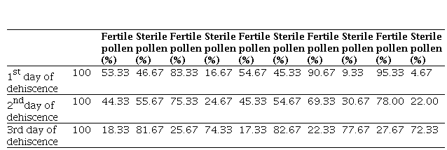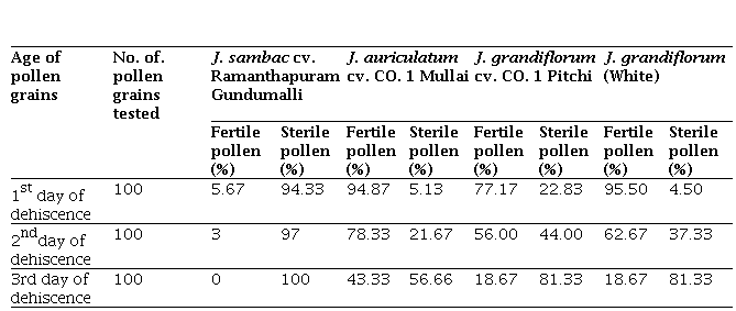 In J. flexile, the percentage of viable pollen was 90.67 per cent on the day of dehiscence and it gradually decreased to 22.33 per cent on the third da y. The percentage of viable pollen in J. calophyllum was 77.17 per cent on the day of dehiscence and it gradually decreased to 18.67 percent on the third day. The percentage of viablepollen in J. multiflorum (Pink) was 54.67 per centon the day of dehiscence and gradually decreasedto 17.33 per cent on the third day. The percentageof fertile pollen in J. nitidum was 53.33 per centon the day of dehiscence and it gradually decreasedto 18.33 per cent on the third day. The percentageof fertile pollen in J. rigidum was 95.33 per centon the day of dehiscence and it gradually decreasedto 27.67 per cent on the third day (Table 3).