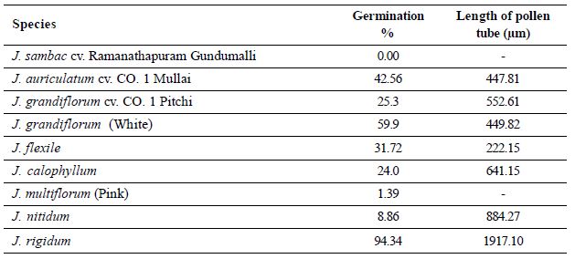 The inferences from the present study are (i) there is wide variation among the nine genotypes with respect to shape of pollen grain while exine ornamentation was reticulate in all the genotypes, (ii) J. auriculatum cv. CO. 1 Mullai, J. grandiflorum cv. White, J. flexile and J. rigidum had high pollen viability. Pollen output (average number of pollen produced/flower) was the highest in J. rigidum (28,660) and the least (625) in J. sambac cv. Ramanathapuram Gundumalli; (iii) The highest rate of pollen germination (94.34%) and length of pollen tube (1917.10 µm) was recorded in J. rigidum.