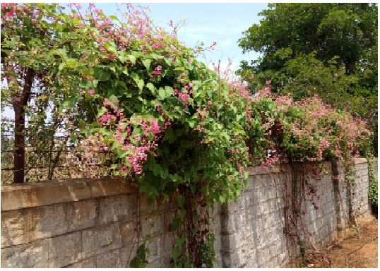 Antigonon leptopus can be propagated through seeds as well as semi-hard wood cuttings. The dual reproductive behavior of A. leptopus is considered as an adaptation for successful survival in tropical environments (Raju et al., 2001). Our experience shows seeds to be a better means of multiplication. The germination rate was fairly high (80-85%). Seeds were sown in pro trays and a month-old seedlings were planted along the boundary wall of the experimental field of ICAR-Indian Institute of Horticultural Research (ICAR-IIHR), Hesaraghatta, Bengaluru (Fig. 1).