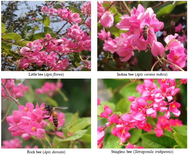 This paper reports the efficacy of Antigonon leptopus Hook. & Arn, a creeper, (Family: Polygonesiae) as one such plant species which attracts a large number of honey bees besides other beneficial insects. Commonly called Coral vine or Mexican creeper or bee bush, A. leptopus is a climber, native to Central America. It produces indeterminate axillary racemes of attractive pink flowers of 20-25 mm diameter and blossoms almost throughout the year. Flowers are an abundant source of nectar and pollen to honey bees. Each flower is estimated to produce 1-1.5 µL of nectar with 26-28% sugar and 0.025-0.036 mg of pollen and attracts a wide range of floral visitors mainly social bees (Raju et al., 2001; Abrol, 2003). There is also a variant of the same species which produces white flowers but occurs at a low frequency. The plant is also known to possess a wide range of phytochemicals like alkaloids, phenolic compounds, saponins, triterpenoids and glycosides in different parts and is valued for its medicinal properties (Rakshit and Raghavendra, 2018).