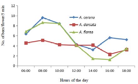 At ICAR-IIHR campus in Hesaraghatta and surrounding places near Bengaluru (13.13° N, 77.47°E), four species of honey bees viz., Indian honey bee, Apis cerana indica Fab., little bee, A. florea Fab., rock bee, A. dorsata Fab. and stingless bee, Tetragonula iridipennis Smith were found foraging on Antigonon flowers throughout the year (Fig. 2). The proportion of different species foraging at a given time was calculated by visually counting different species from 10 plants during peak foraging hours. Among all insects visited flowers of Antigonon, honey bees constituted 89.09 per cent while all other insects together (butterflies, moths, wasps, syrphids, calliphorids and ants) constituted the remaining 10.91 per cent. Within four species of honey bees foraged on Antigonon, A. florea was the most dominant forager (constituting 34.06% of total foragers) followed by A. cerana (27.18%), A. dorsata (21.34%) and T. iridipennis (5.51%). Diurnal variations in foraging activity of different species indicate that though bees were found visiting flowers throughout the day, there were significant variations in the number of worker bees foraging at different periods of the day. The major peak activity was recorded between 6.00 – 10.00 AM followed by a minor peak between 4.00 and 6.00PM. Among three Apis species, the wild rock bee was found to maintain relative consistency throughout the day with least variations in their numbers while the foraging activity of other two species had significantly come down during afternoon hours till evening. This is an indication of their sensitivity to higher temperatures. In a related study by Reddy et al. (2015), increase in maximum temperature was reported to adversely affect the foraging activity of A. cerana.