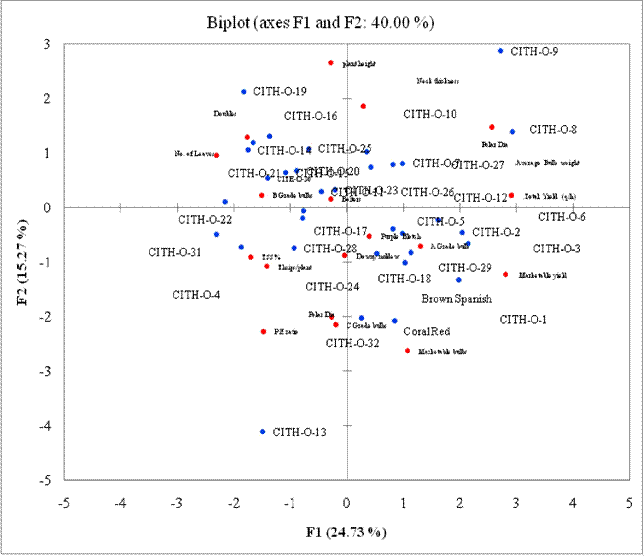 The positive and negative loading of quantitative traits reflects the positive and negative correlation trend between the components and variables suggesting that these principle components may be used to summarise the variables. The traits with largest absolute value closer to unit within first component influence the cluster more than those to lower absolute value closer to zero. Thus in present study the differentiation of genotypes in different principal component was because of high contribution of few characters rather than small contribution of each character. The desirable characters loaded positively and undesirable characters loaded negatively in first seven PC’s could be in consideration while selecting the genotype for appropriate traits and yield potential. The principal component analysis has also been used for showing the genetic diversity in many species (Ravindra et al., 2018; Singh et al., 2017). The Bi-plot of PC-I & PC-II indicated that the some isolated genotype clearly define the diversity among the evaluated germplasm. The genotype CITH-0-13, CITH-0-4, CITH-0-22, CITH-0-19, CITH-0-9, CITH-06, CITH-O-2 and variety Coral Red were most divergent (Fig 1) usually is customary to select oneof the important variable from these identified groupsfor targeted improvement programme. Hence PC-Ifor higher total yield, PC-II for plant height, PC-IIIfor high T.S.S, PC-IV for maximum A Grade bulb,PC-V for wider polar diameter of bulb, PC-VI forresistance to purple blotch, PC-VII for thin Neckthickness of bulb were ideal for selection . Theresults of present study are useful as it furnish theinformation about the group where certain traits aremore important, allowing breeder to execute breedingfor specific target. Biological implication of principalcomponent analysis can be quantified by contributionof different variable in each PC as revealed by Eigenvector and cluster scor e at the component axissuggest that some relationship exist among theindividuals with the cluster but not provided the exactposition of genotypes in groups.