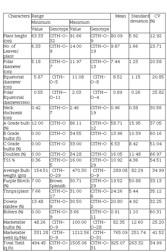 The genotypes evaluated for all horticultural traits varied significantly (Table 2). The phenotypic variability expressed by range, standard deviation, and coefficient of variation. The plant height ranges from 63.33 to 91.66 cm. Genotype CITH-O-9 recorded highestplant height, whereas CITH-O-32 recorded lowest plant height (63.33 cm). Number of leaves ranged from 6.33 (CITH-O-9 ) to 14.0 cm (CITH-O-19. Polar diameter of bulb ranged from 5.18cm (CITH-O-7) to 11.97cm (CITH-O-13). Equatorial diameterof bulb ranged from 5.87cm (CITH-O-5) to 11.08 cm (CITH-O-8). Polar and equatorial diameter ratio reflects the bulb shape which is an important parameter indirectly related to yield storage life and market preference. The bulbs of genotype having < 1 Polar and equatorial diameter ratio ( P: E ) considered as flat and genotypes having P: E ratio 1 considered globe and those having P: E ratio> 1 were considered as torpedo. Genotype CITH-O-11, had P: E ratio 1,whereas CITH-O-4, CITH-O-32 and CITH-O-13have < 1 P: Eratio and remaining genotypes were having >1 P: E ratio. Neck thickness of bulb affects the storage life. Neck thickness ranged from 0.42 to 2.46 cm. The minimum neck thickness (0.42 cm) was observed with genotype CITH-O-7 , whereas CITH-O-19 had maximum neck thickness (2.46 cm). Bulb grade determines the market price and quality. A grade bulb ranged from 12 to 86.11 per cent (Table 3). Genotype CITH-O-12 recorded highest A grade percentage of bulbs. B grade bulb ranged from 00 to 34.55 per cent. Double bulbs which are major drawback in onion production ranged from 00 to 34.28 percent. Total soluble solids important quality trait in onion ranged from 0.36 to 16 per cent. Genotype CITH-O-29 scored highest TSS (16 %) whereas minimum TSS(0.36%) was recorded with genotype CITH-O-5.Average bulb weight which is directly correlated with yield, ranged from 154. 51 t o 470. 3 0 g.Genotype CISH-O-9 recorded the highest average bulb weight (470.30 g) whereas smallest bulb size was recorded with CITH-O-29 (154.51 g). Foliar disease of onion is major problem in long day conditions. The incidence of purple blotch ranged from 7.00 to 30.71%. Genotype CITH-0-29 has recorded highest infestation (30.31%) whereas, least infestation was observed with variety Brown Spanish (7%). Downy mildew infestation ranged from 13 . 48 to 30. 50%. T he lowest ( 13. 48%)infesta tion of downy mildew wa s obser ved ingenotype CITH-0-9 whereas highest infestation of was recorded with CITH-0-2 (30.50%). Thrips ismajor damaging insect in long day onion. Number of thrips/plant ranged from 7.66 to 31.00 / plant.T he minimum infesta tion of thrips /plant was recorded with genotype CITH-0-6 (7.66/plant) whereas, maximum number of thrips / plant wasobserved with CITH -0-17 (31.00/plant). Prematurebolting a burning problem in onion ranged from 0 to 3.66 % among the genotypes evaluated. The highest percent of bolt ing was observed in genotype CITH-0-11 (3.66%), where as four teengeno types recorded 0% bolting. Marketable bulb percenta geis an important trait from economic point of view. The percentage of marketable bulbr anged from 48.26 to 100% . The lowes market table bulb percent age (48 . 26 %) was recorded with genotype CITH-09 where as CITH-0-28 had recorded 1 0 0 % market ablebulbs. Marketa blebulb yield ranged from 33 1. 28 to1212.56 q/ha. The lowest marketable bulb yield was recorded with genotype CITH-0-31 (331.28 q/ha ) where as highes market ablebulb wa srecorded with CITH-0-8 (1212.56 q/ha). Total yield ranged from 494.5 to 1505.06 q/ha. Among thegenotype evaluated, CITH-09 recorded highesttota l yield, where as minimum tota l yield was observed with CITH-0-31. The genotype having the highest desirable traits may be utilised for crop improvement programme for a particular trait. Coefficient of variation (%) reflected the extent of variationfor evaluated phenotypic traits was highestfor double bulb percentage and B grads of bulbs,T. S. S and market ablebulb yield (q/h) . High coefficient of variation a mongst udied traitsindica tedan ppreciable variability which isprerequisite of acrop improvement program. Similar type of variability was also reported by Arya et al. (2017). The observed variability foundamong the onion genotypes might be related to genetic makeup of genotype as per Kandil et al. (2010).