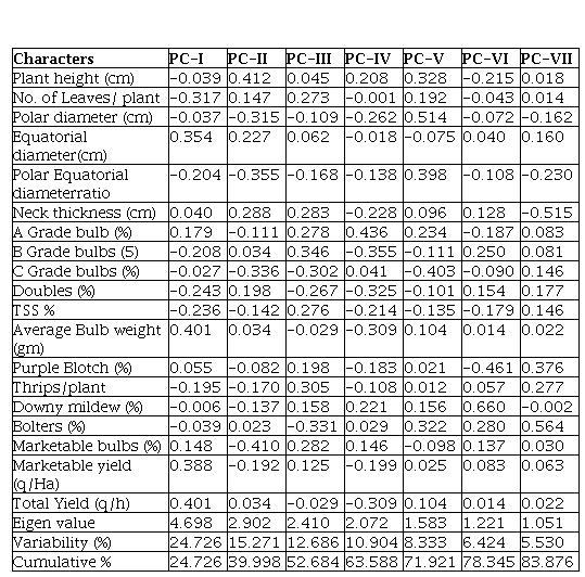 Based on degree of divergence 34 genotypes were grouped into 7 principal component having Eigen value >1 and cumulatively accounted for 83.87% of total variability (Table 4a and 4b). The PC-I contributed for 24.73% of total variation was positively loaded with bulb weight, marketable bulb percentage, total and marketable bulb yield. It was negatively correlated with number of thrips per plant, downy mildew infestation, (%) bolters and doubles, B and C grades bulbs. The PC-II reflected 15.27% of total variability and was positively loaded with plant height, neck thickness and negatively with downy mildew infestation. The PC-III was positively loaded with T.S.S. (%), number of leaves/plant and contributed 12.69 % of total variation. The 4th principal component contributed 10.90% of total variability was, associated with A grade bulb (%) and negatively correlated with purple blotch disease.The PC-V accounted 8.33% of total variation was positively loaded with polar diameter, Polar: Equatorial. Diameter ratios, bolter percentage and negatively loaded with C grade bulb percentage. Principal Component-VI contributed 6.42% of total variation and was positively correlated with downy mildew (%) but it was negative associated with purple blotch. PC-VII accounted for 5.53% of total variation was positively loaded with bolter percentage, purple blotch percentage, and number of thrips/plant and was negativity correlated with neck thickness.