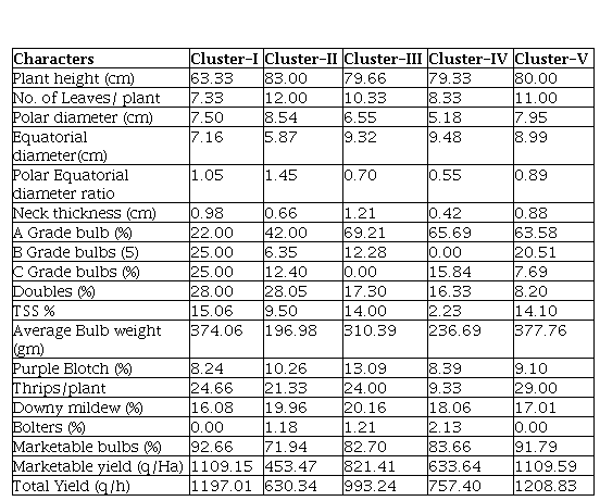 Based on single linkage cluster analysis genotypes were grouped into five clusters by quantifying their share and cluster means for all the traits (Table 4 a,b). The cluster-I and Cluster-III accommodated maximum number of genotype (9) followed by cluster II (8), Cluster-IV (7) and cluster -V(1) contributing 26.47, 23.53, 20.58 and 2.94%, of total population respectively. On the basis of cluster means, the cluster-I was important for high TSS (15.06%), marketable bulbs percentage (92.66%) powdery mildew (8.24%) and purple loch (16.08%) resistance. Cluster-II was important for plant height (83 cm) number of leaves/plant(12), polar diameter (8.54 cm) and P:E ratio (1.54) cluster -III was important A grade bulb percentage (69.21%)whereas cluster-IV was important equatorial diameter ( 9.48 cm),minimum neck thickness (0.42 cm) thrips resistance (9.33 thrips/ plant). Cluster -V was important for average bulb weight (377.76 g) marketable yield (1109.59 q/ha) and total yield (1208.83 q/ha). The genotype of cluster having high means value of particular traits would contribute more positively in their off springs if used as a parent. Arya et al. (2017) and Singh et al. (2017) also suggest that clusters having high meanvalue of the traits may be used for hybridizationprogram to get better segregates.