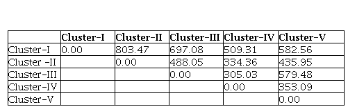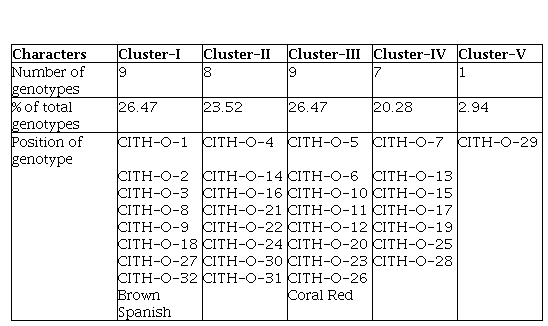 Proximity matrix obtained, suggest the resolution for 34 onion genotype distributed in five clusters with wide range of diversity for the traits (Table 5.) The highest inter cluster distance between cluster II and Cluster I (803.47%) followed by cluster-III and I (697.8) cluster V and cluster I (582.56). Based on convention that distantly related parents give better recombinants and hybrid. It could be expected that hybridization between genotype of these cluster will results high heterotic F., s and better recombinants in segregating generations. These genotypes of distant clustercould serve useful source of genes for different desirable traits in onion. The findings are in conformity with finding of Singh et al. (2017), Chattopadhay et al.(2015) and Ravindra et al. (2018) who reported that genotypes among the cluster having high distance when used in hybridization programme will obtain awide spectrum of variation in sergeants.