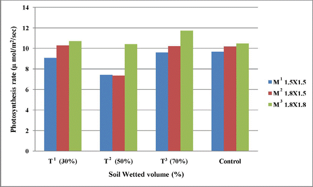 The photosynthetic response of papaya is strongly linked to environmental conditions through stomatal behavior (Zhou et al., 2004). The photosynthetic rate recorded in papaya in different treatment combinations is depicted in Fig.1. It was observed that the spacing of papaya plant to a distance of 1.8m x 1.8 m influenced the photosynthetic rate (10.85 µ mol/m /s) significantly as compared to 1.5 m. x 1.5 m. (9.09 µ mol/m /s) although it was at par with the spacing of 1.8 m. x 1.5 m. (9.48 µ mol/m /s). Among the irrigation levels, meeting 70% of the ER and wetting 70% soil volume recorded the highest photosynthetic rate (10.52 µ mol/m /s) which was found to differ significantly with 50% of the ER wetting 50% of the soil volume (8.41 µ mol/m /s). Although the interaction effects were not significant, the highest photosynthetic rate of 11.73 µ mol/m /s was recorded with 1.8 m x 1.8 m spacing at 70%ER irrigation wetting 70% soil volume. Santas et al., (2015) also affirmed that the fruit production and physiological characteristics of papaya depend on planting spacing.