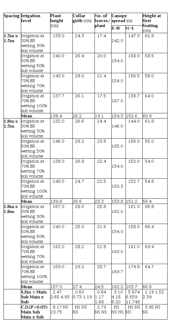 Closer planting at 1.5m x 1.5m distance had shown significantly higher root volume (2148 cm3) as compared to either 1.8m x 1.5m (1983 cm3) or 1.5m x 1.5m (1671 cm3 ). Among the irrigation levels, meeting 70% ER and irrigating in part of the root zone (70%) was found to have higher root volume (2572 cm3 ) significantly differing from others. Further, the interaction between spacing and irrigation levels was significant with highest root volume (2833.3 cm3) observed under 1.8m x 1.5m spacing with irrigation meeting 70% ER and wetting 70% of the root zone.