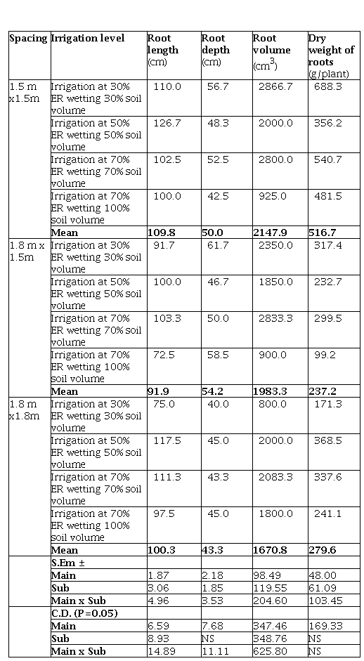 Root growth in general was significantly influenced both by the plant spacing as well asirrigation levels. Root length was significantly higher with 1.5 m. x 1.5 m spacing (109.8 cm) ascompared to either 1.8 m. x 1.8 m. (100.3 cm) or 1.8m. x 1.5 m. (91.9 cm). Among the irrigation levels, meeting 50% ER and irrigating in part of the root zone (50%) was found to have higher root length (114.7 cm) significantly differing from others. Further, the interaction between spacing and irrigation levels was significant with highest root length (126.7cm) recording in1.5m x 1.5m spacing with 50% ER irrigating in 50% of the root zone (Table 2)