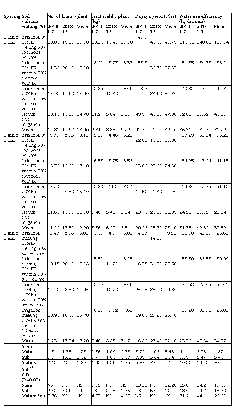 Although papaya is generally considered to be drought sensitive and responsive to irrigation, there is a shortage of good experimental evidence to support this view. There is a need to establish practical irrigation schedules for this remarkable crop. Further, to enhance the productivity of the crop, optimum plant population is very crucial. When spacing is varied, it further warrants for understanding the requirement of wetted volume for standardizing the drip irrigation practice in a given agro-climatic condition. Keeping this in view, field experiments were conducted to adjudge an optimumsoil volume wetting in papaya along with different plant spacing.