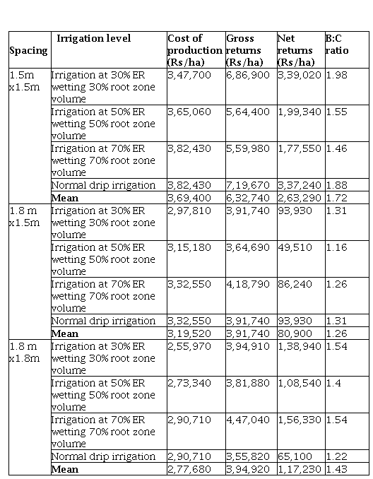 Among the irrigation levels, the gross returns were relatively higher (Rs. 4,91,180/ha) with irrigation at 30% ER and 30 per cent soil volume wetting, which may be attributed to the better soil moisture availability under the treatment in turn improving the productivity. Similarly, the net returns were also relatively higher with the treatment. Closer spacing of 1.5 m x1.5m also recorded higher benefit cost ratio which may be attributed to both higher plant population (44% higher) and the yield per plant (28% higher). Higher benefit cost ratio with spacing of 1.5m x 1.5m clearly indicated that it is worth to spend more for the inputs with closer spacing. Further, benefit cost ratio was relatively higher with 70 per cent soil volume wetting as compared to other irrigation levels.