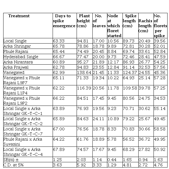 The mean performance of cultivars for vegetative growth characters (Table 1) reflected the variations among the cultivars. The earliest spike emergence was observed in cv. Arka Nirantara (60.89 days) but the genotype GK-T-C-4 required maximum days for spike emergence (67.89 days). Significantly highest plant height was recorded in cv. Variegated (138.64 cm) and less in hybrid Phule Rajani X Arka Suvasini (61.76 cm) compared to other genotypes. This is in accordance with the results of Ranchana et al. (2013). More number of leaves per plant were observed in genotype GK-T-C-2 (24.11) and less in cv. Local Single (17.00). Flower bud was initiated at 5.78th node in hybrid Phule Rajani x Arka Suvasini while cv. ArkaPrajwal flower bud started at 12.84th node which was noted to be the highest. The significantly longest spike was observed in cv. Variegated (124.37cm) and shortest in hybrid Phule Rajani x Arka Suvasini (56.52 cm). Hybrid L1P4 recorded significantly maximum rachis length (39.78 cm) amongst 15 genotypes under study. The variation among different vegetative characters are attributed due to the difference in their genetic makeup. Thenumber of florets recorded to be highest in genotype GK-T-C-7 (58.58). However, less number of floretswas recorded in genotype L9P2 (34.53). Number of florets is an important character, as single type flowers are mostly used as loose flower. The variation in florets per spike may be due to genetic variability, disparity in storage of food among different cultivarsand prevailing environmental condition.