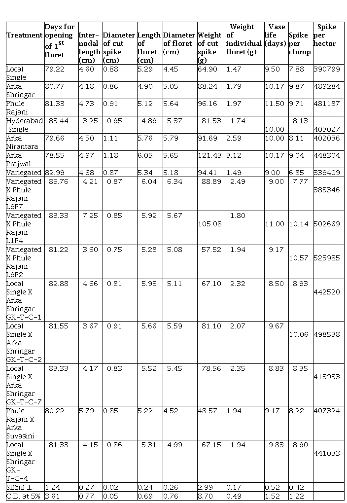 Cultivar Arka Prajwal recorded maximum floret length (6.05 cm) and significantly minimum length of floret was recorded in cv. Hyderabad Single (4.89 cm). The diameter of floret was noted significantly maximum in hybrid L9P7 (6.34 cm) and minimum was recorded
