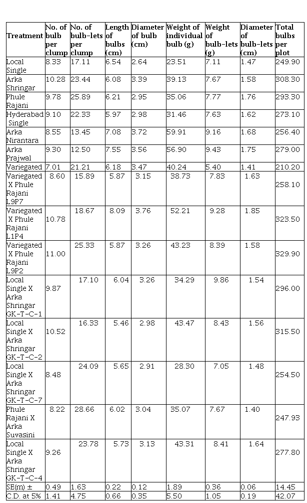 Phule Rajani x Arka Suvasini (28.66) whereas, minimum were observed in cv. Arka Prajwal (12.50). Genotype L1P4 exhibited maximum length of bulb (8.09 cm) while genotype GK-T-C-2 recorded minimum (5.46 cm). The variation in number of bulbs produced per clump might be due to genetic factor which is further modified by prevailing environmental condition and the results are in consonance with finding of Chaturvedi et al. (2014) and Mahawer et al. (2013) in tuberose.Hybrid L1P4 exhibited maximum diameter of bulb (3.76 cm) and bulb-lets (1.85 cm) while minimum diameter of bulb was recorded by cv. Local Single (2.64 cm). However, heavier bulb was produced by cv. Arka Nirantara (59.91 g) while it was lighter in cv. Local Single (23.51 g). Genotype GK-T-C-1 recorded maximum weight of bulb-lets (9.86 g). The variation in bulb weight per plant among different genotype at bulb harvesting stage might be due to the distinguished varietal genetic makeup with more leaves to improve photosynthetic activity, source sink relationship to accumulate more carbohydrate and prevailing condition.