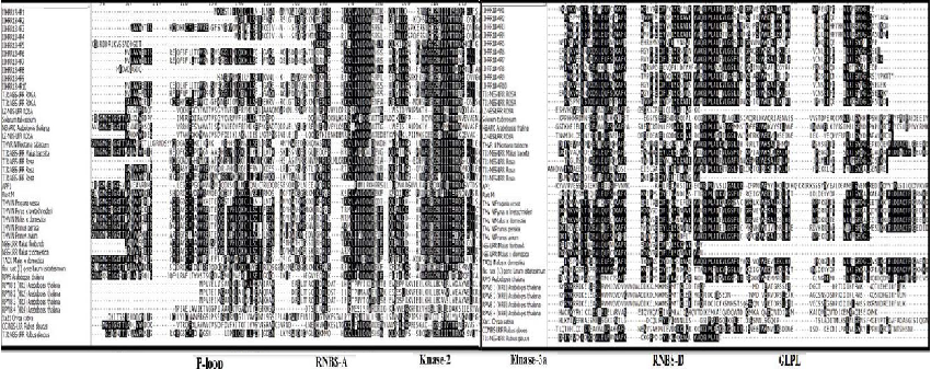 Multiple sequence alignment identified highly conserved amino acid motifs present in the RGAs of IIHRR13-4. Multiple sequence alignment of IIHRR13- 4 RGAs was performed with other R genes of Rose, Arabidopsis, Solanum, Nicotiana, Malus, Prunus, Fragaria and apoptotic protease activating factor(APAF) gene (Fig. 2). Six highly conserved amino acids motifs of NBS domain identified were P- loop, RNBS (Resistance nucleotide binding Site)-A, Kinase-2, Kinase-3a, RNBS-D, and GLPL. NCBI CD-search (Conserved Domain software) was used to find and confirm the conserved domains of RGAs and presence of nucleotide binding domain (NBARC domain) and LRR3 super family domain. The selected RGAs were further analysed for their phylogenetic relationships among Rosaceae family and other plant R genes.