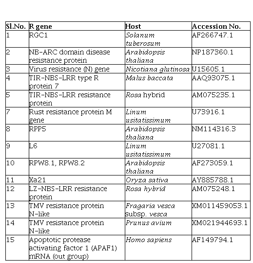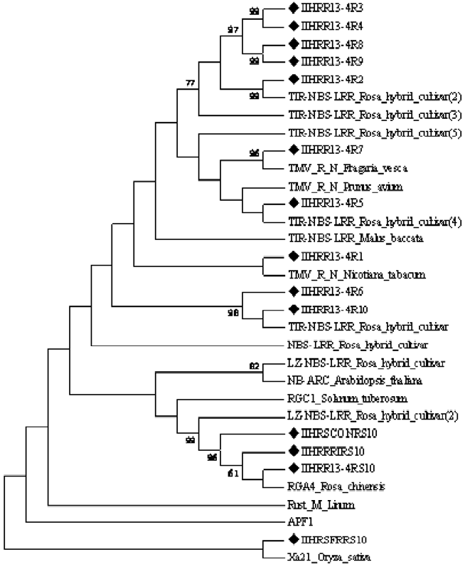 The R gene sequences retrieved from NCBI database used in the phylogenetic analysis are listed in the Table 4. RGAs identified in the present study showed similarity to both TIR class of NBS-LRR RGAs and Non-TIR (LZ) class of NBS-LRR. RGAs identified from susceptible varieties showed similarity to RGAs of Rosaceaefamily but some of them excluded after amino acid translation because of the presence of internal stop codons. Finally thirteen RGA sequences viz., IIHRR13-4R1, IIHRR13-4R2, IIHRR13-4R3, IIHRR13-4R4, IIHRR13-4R5, IIHRR13-4R6, IIHRR13-4R7, IIHRR13-4R 8, IIHRR13-4R9, IIHRR13-4R10, IIHRR13-4RS10 (IIHRR13-4), IIHRSFRR10 (First Red) and IIHRRRIRS10 (Rosa indica) were identified in this study.