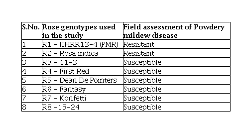Rose is one of the economically important ornamental crops from Rosaceae family and it has the highest economic impact in the world. Rose flower industry comprises of local and international marketing of cut flowers, loose flowers, scent, oil and medicines. The worldwide estimated production of rose is 18 billion cut stems, 60-80 million potted-rose and 220 million for landscape purposes (Debener and Byrne, 2014). Apart from roses, other economically important members of Rosaceae family are apples (Malus), strawberries (Fragaria), stone fruits like peach, plum, apricots (Prunus) and pears (Pyrus). Most of the species of Rosaceae family are woody perennials. There is a wide range of pathogens viz., fungi, bacteria, virus, phytoplasma and nematodes that attacks rose plants causing its death and thereby reducing the marketability of roses. Powdery mildew is one of the most damaging diseases of Rosaceae family (Xu et al., 2007). Podosphaera pannosa (Wallr.:Fr.) de Bary is an obligate (biotrophic) pathogen (order Erysiphales, phylum Ascomycotina) that inhabits numerous economically important plants.Severe powdery mildew infection reduces greenhouse cut flower production (Leuset al., 2003; Xu et al., 2005, Debener and Byrne, 2014).