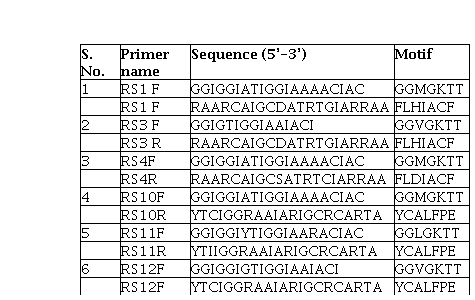 Genomic DNA was isolated from coppery red rose leaves by CTAB method (Doyle and Doyle, 1987). Six sets of degenerative primers (Table 2) were used for amplification of RGAs. RS1 RS2 and RS3 primer pairs were specific for TIR-NBS-LRR type and RS10, RS11 and RS12 were for LZ type (Hattendorf and Debener, 2007a). PCR assays were performed with genomic DNA in a total volume of 25 μl containing10μM of forward and reverse primers(Sigma Aldrich, India), 3 units of Taq polymerase and2.5 mMTaq buffer (Genei, Bengaluru, India). PCR reaction was performed in Eppendorf thermal cycler with initial denaturation at 940C for 3 min, 35 cycles of 940C for 1 min, 420C for 1 min, 720C for I min followed by final extension step at 720C for 10 minutes (Hattendorf and Debener, 2007a).