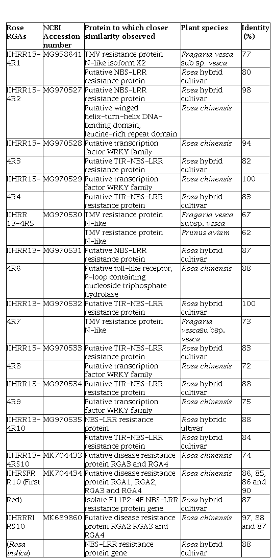 Several RGAs present in each plant genome may or may not link to resistance. The IIHRR13-4 was found resistant to powdery mildew in field evaluations. The powdery mildew resistant line IIHRR13-4 was studied along with other resistant and susceptible rose lines. The RGAs were identified from all rose genotypes and some were excluded because of stop codons. Finally eleven RGAs selected from the IIHRR13-4 that might be linked to resistance mechanisms. This is the initial study on resistance mechanisms in the rose line IIHRR13-4 against powdery mildew disease. The expression analysis studies (N. K Chandran, Personal communication) revealed more expression of RGAs and resistance related transcription factors in IIHRR13-4 compared to susceptible cultivar konfetti upon powdery mildew infection. The comparison between IIHRR13-4 and konfetti revealed that expression level of RGA transcripts might not be sufficient to elicit resistance in konfetti. This indicates the importance of proper and required expression of disease resistance gene against particular pathogen. This study indicates that several R gene candidates (RGAs) are present in rose plants but only few are linked to disease resistance. These RGAs identified from IIHRR13-4 might be putative derivatives for R gene(s) against powdery mildew and may help in future research on mapping and characterization of R genes from IIHRR13-4.