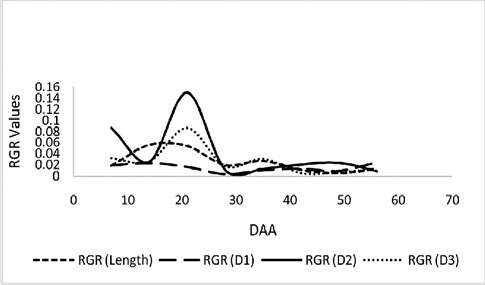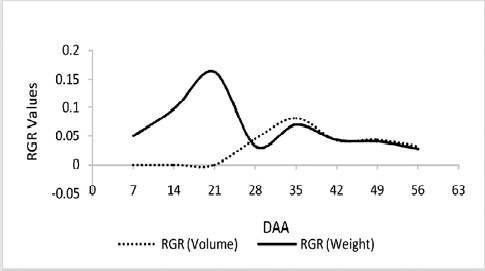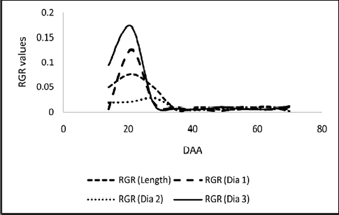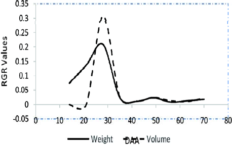 The RGR curve (Fig 1) shows that there was a rapid development from 7th to 35th day and then, the growth rate slowed down towards the 49th DAA, which later slightly increased (between 49 and 56 DAA) then decreased towards the harvest. The second increase recorded can’t be considered as a peak, whereas the initial or first increase is definitely a peak, therefore depicting a sigmoid curve.