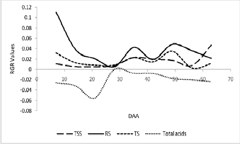 In Pink variety, the percentage of total titrable acids decreased from 0.42 (7 DAA) to 0.11 per centduring harvest. The rate of decrease in total acids touched a lowest peak 28 to 35 DAA and after being stable for one more week, it steadily decreased till harvest stage (70 DAA).In white wax apple, the total titrable acids reduced from 1.43 per cent (7 DAA) to 0.19 per cent (63 DAA) during harvest. The RGR curve showed that, the decrease in acidity was steady and uniform from seven to 35 DAA, whereas, it reached a negative peak during 35-42 DAA, again followed by a steady decline in acidity percentage till harvest, therefore, depicting a single sigmoidal pattern (Fig 5). In similar studies, it was reported that the decrease in fruit acidity coincided with an increase in sugar content of the fruits.The lowest amount of titrable acidity (0.78%) was observed in the ‘JambuMadu Red’ cultivar, followed by ‘Giant Green’ (0.83 %) and ‘Masam Manis Pink’ (0.90%). It has also been recorded that the soluble solids content in ‘JambuMadu Red’ was wide-ranging from 5.63 to 12.5% Brix (Moneruzzaman et al, 2015). In a different study, Moneruzzaman et al (2012 c) reported that titrable acidity of wax apple was 0.78 %.While comparing chemical composition changes in two types of wax apples, Rosnahet al (2012) found that, the total acidity of Kristal Taiwan (green white type) ranged between 0.2-0.25%, while the total acidity of Semarang Rose (pink type) were between 0.07-0.1%. These results are in corroboration with the results of this study.