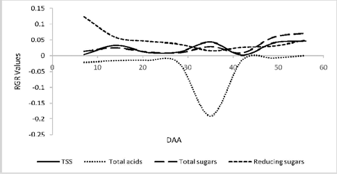Similarly, in pomegranate fruit development, a significant increase in TSS, total sugars and reducing sugars was observed 80 DAA, with a maximum values on 140 DAA. The equilibrium concentration of these biochemical on 100 DAA mark optimum maturity and the further increase is during phase of ripening (Kulkarni and Aradhya, 2005). Likewise, in both types of wax apples studied, there was a peak in increase of sugars between 30 and 40 DAA and then after 50 DAA.