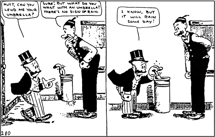 Na tira da Figura 2, traduzida por nós, Jeff diz a Mutt: “Mutt, você pode me emprestar seu guarda-chuva?” Em seguida, Mutt – com a mão no rosto e uma expressão de surpresa – responde: “Claro, mas o que você quer com o guarda-chuva? Não há nenhum sinal de chuva”. Na continuidade da conversa surge o elemento cômico referendado pelo texto e pela imagem, pois Jeff diz: “Eu sei, mas vai chover algum dia”. Tanto a figura de Mutt, concentrada, quanto a ideia de Jeff, marcada pela oração “vai chover algum dia” e pela imagem que o apresenta pegando o guarda-chuva, em função das relações dialógicas que são realizadas com o contexto ali vivenciado, conotam que Jeff quer mesmo é se apropriar do bem do amigo, a fim de suprir uma necessidade futura e particular.