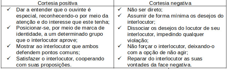 Brown e Levinson (1987) apontam para os objetivos das estratégias de cortesia positiva e negativa. Da positiva, como advém do desejo de apreciação e aprovação da própria imagem, derivam: