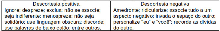 Para explicitar o que seria de fato descortesia, Culpeper (1996), baseado nos recursos de cortesia de Brown e Levinson (1987), apresenta uma lista de estratégias de descortesia positiva e negativa: