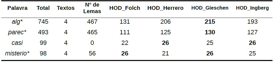 No escopo deste artigo, serão apresentados apenas os dados gerados na primeira fase de investigação completa, isto é, os dados gerados a partir do uso da aba Lista de Consistência Detalhada e da ferramenta Lista de Palavras, com ênfase para a análise dos elementos das escolhas linguísticas no nível microestrutural. Investigou-se a frequência dos itens lexicais formados a partir dos nódulos de busca alg* e parec* nos quatro TTs para o espanhol de HOD, para a extração de dados sobre a recorrência dos derivados de alg* e formas flexionadas do verbo parecer, bem como os padrões de colocações e/ou agrupamentos lexicais formados a partir desses nódulos.