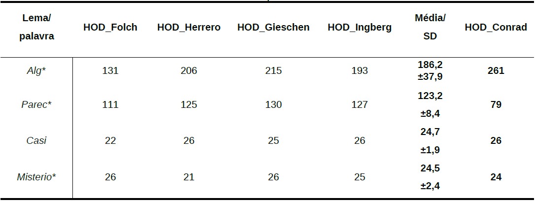 Após a geração da lista de consistência detalhada com as palavras que desenvolvem o tema de incerteza nos TTs e TF, e tendo em vista que um dos objetivos desta pesquisa é a verificação das mudanças nos padrões de escolhas dos itens lexicais que ajudam a construir o tema de incerteza nos TTs, comparados entre si e em relação à obra de Conrad, foi necessário o cálculo estatístico de média e SD, desvio padrão (representado pelos sinais ±), para a comparação de quais foram as formas derivadas/flexionadas dos lemas que representaram escolhas significativas dos tradutores entre si e em relação ao TF. Portanto, apresenta-se a Tabela 3 a seguir com os dados estatísticos citados.