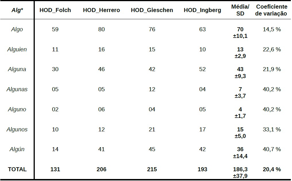 A princípio, nota-se que as variações de alg* foram as mesmas nos TTs, não aparecendo nenhuma palavra formada a partir de alg* que não ocorresse em um dos textos, porém observaram-se alterações na frequência individual das palavras com alg* nos TTs entre si. Para a forma alguna Folch apresentou média (30), abaixo do valor mínimo esperado (33,7), e para a forma do plural, algunas, Gieschen apresentou um valor acima (12) do maior valor esperado (10,7). Para a forma algunos o valor máximo esperado é de 20 e Gieschen apresenta média de 21, acima do esperado. Em relação ao singular, alguno, o valor mínimo esperado é de 2,3 e Folch apresenta frequência de 2 ocorrências, apresentando novamente frequência inferior à esperada. Em relação à forma derivada algún viu-se que o valor mínimo de frequência esperado é de 21,6 e Folch apresenta frequência 14, muito abaixo do valor mínimo. Além disso, ressalta-se o fato de que para as formas derivadas algo e algunos Folch apresentou a média mínima, reforçando assim a premissa de que Folch possui uma tendência a suprimir o recurso de reiteração dessas palavras.