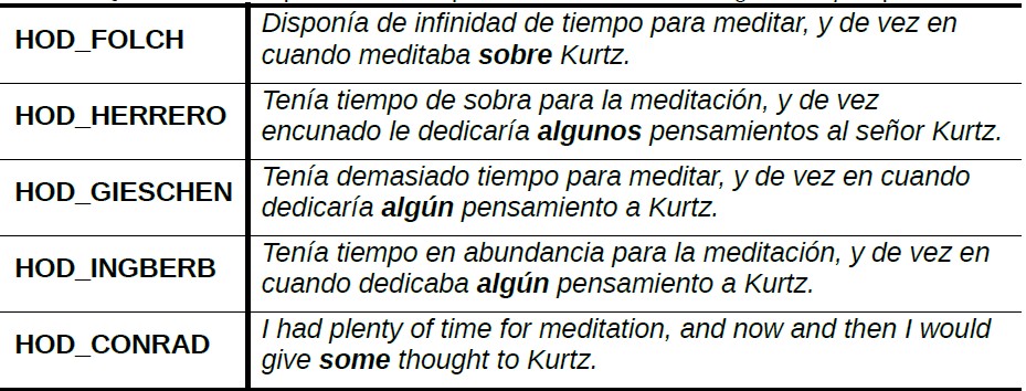 No Quadro 5, observou-se que na tradução de some thought Herrero, Gieschen e Ingberg optaram por palavras formadas com alg* (algún e algunos), mas Folch, que é o tradutor que menos utiliza palavras formadas a partir de alg*, muda a estrutura da oração e retira o pronome.