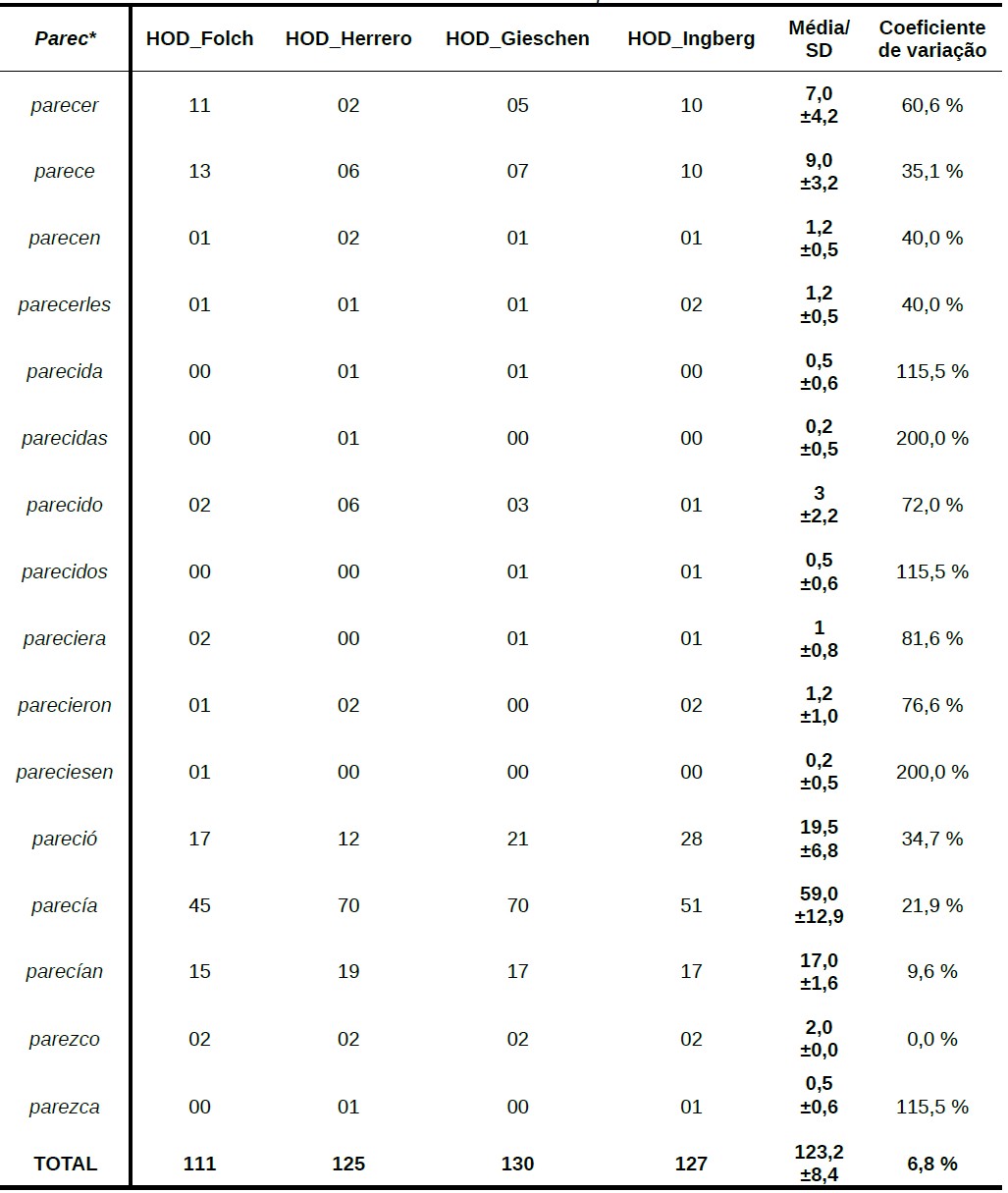 A análise dos resultados do coeficiente de variação de cada forma flexionada em todos os TTs mostra que os índices mais altos de variação são referentes às formas parecida (115,5 %), parecidas (200%), parecidos (115,5%), pareciesen (200%) e parezca (115,5%). Estas, entretanto, foram formas que apareceram uma única vez em algumas traduções, ou seja, parecida foi usada por Herrero (1) e Gieschen (1), parecidas por Herrero (1), parecidos por Gieschen (1) e Ingberg (1), pareciesen por Folch (1) e, por fim, parezca por Herrero (1) e Ingberg (1). O valor elevado do coeficiente de variação dessas formas indica que seu uso não era esperado, o que pode ser interpretado como escolha individual dos tradutores, porém, não tão relevantes para esta análise, pois não há consistência no uso.